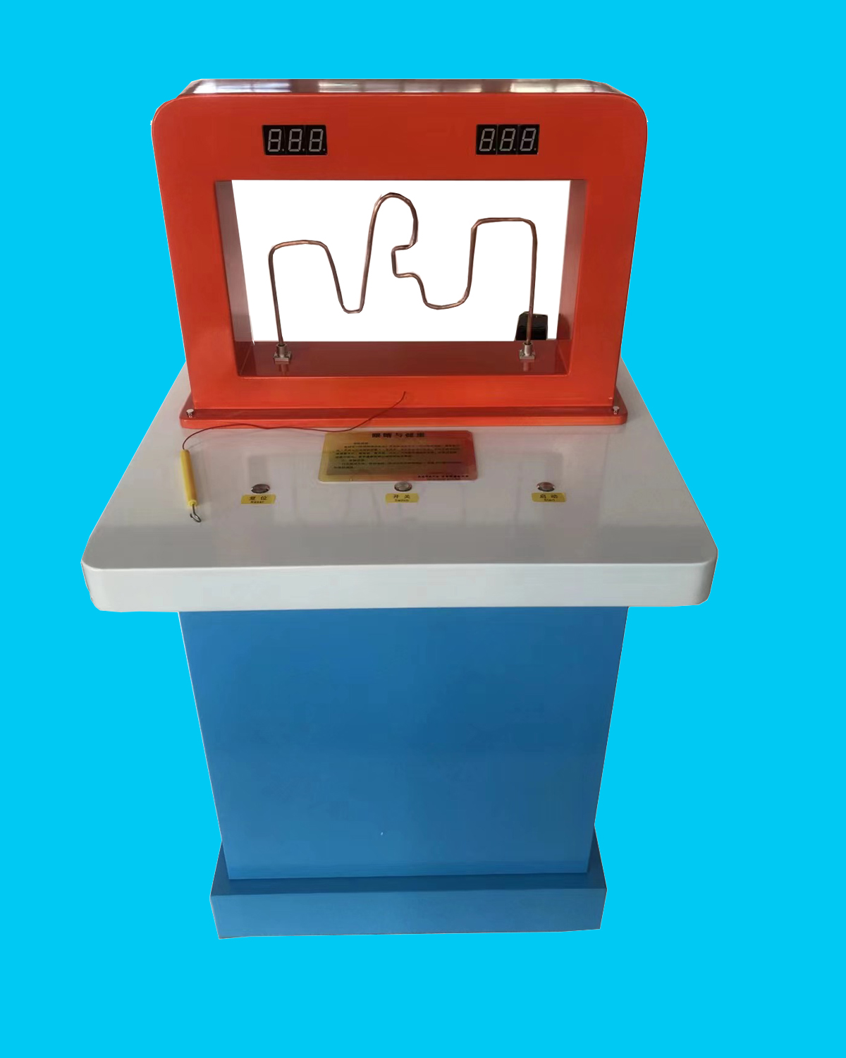 三、功能概述:此展項為人體測試項目,主要由展臺、說明牌、特殊造型的金屬彎曲軌道、金屬手柄、蜂鳴器等組成,測試人的手、眼協調能力。