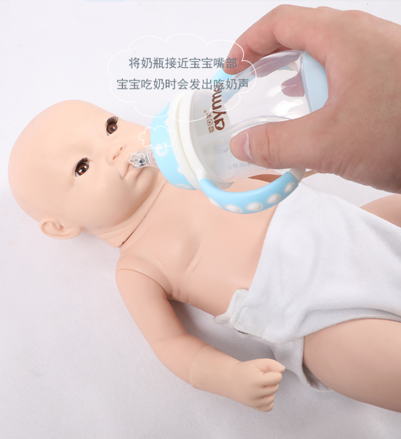 產品詳細介紹高智能嬰兒模擬人、高智能嬰兒互動照料模擬人 ZH/FT332 產品介紹: 高智能嬰兒模擬人造型逼真,適合護理和兒科臨床工作者及初為人父母的人們使用,可練習嬰兒日常護理所需的各種技能和技巧,設定6種不同場景以實施對嬰兒的不同護理需要。 一、功能特點: ■仿真嬰兒模型,采用高分子材料制成,膚質仿真度高,四肢靈活。 ■模型尺寸:50×25×12cm(頭圍34cm、肩寬13cm、胸圍31cm、凈重約1.35kg)。 ■娃娃設有6種不同照護模式(正常、饑餓、過飽、尿濕、發熱、恐懼),不同場景的設置能夠模擬出真實狀態下嬰兒的表現特征,各模式可自動循環或在某些操作完成后相互切換。 ■在不同的場景下可通過測肛溫、喂奶、愛撫、更換尿布、擦浴等操作使其進入其他狀態。 ■開、關機:按下左手開機鍵,寶寶進入安靜的正常狀態,會發出“呀”音,提示開機狀態,在開機狀態下任何時候再次按下左手開機鍵,則自動關機。 ■喂奶:將奶瓶接近寶寶嘴部,寶寶吃奶時會發出吃奶聲。 ■更換尿布:將配套的尿布通過腰部兩側的按扣固定在寶寶小屁股上或將尿濕的尿布取下。 ■敷冰袋:將冰袋敷在寶寶額頭一分鐘左右。 ■生命體征測量: • 脈搏測量:按住寶寶左手脈搏鍵約5 秒后會自動報出脈搏頻率。 • 體溫測量:將體溫計插入肛門約10 秒后拔出會自動報出體溫值。 ■與寶寶交流: 1、正常模式:撫摸寶寶頭部會發出隨即呀呀聲;撫摸寶寶背部發出笑聲;將奶瓶接近嘴部時發出吃奶聲。 2、饑餓、尿濕、發熱、恐懼模式:寶寶會哇哇大哭這時候需要判斷寶寶哭鬧原因并及時給予正確的護理方能使寶寶安靜下來,護理操作包括:喂奶、換尿布、敷冰袋、輕輕安慰寶寶。 • 饑餓模式:應及時喂奶,若寶寶沒吃飽便移開奶瓶后寶寶繼續發出哭聲,直至吃飽(大約需150 秒)。 • 尿濕模式:應及時更換尿布。 • 發熱模式:體溫脈搏會持續上升,此時應及時敷冰袋,敷冰袋持續一分鐘后寶寶會停止哭聲,脈搏和體溫持續下降,直至恢復正常狀態。 • 恐懼模式:輕輕多次撫摸嬰兒頭部或背部后哭聲會逐漸減少,直至恢復正常狀態。 3、過飽模式:此時喂奶寶寶會發出聲音表示“我吃飽!”拍打或撫摸背部時寶寶會發出打嗝聲。 二、標準配置: ■高智能仿真娃娃:1個 ■配套場景識別奶瓶:1個 ■說明書:1冊 ■保修卡合格證:1張 ■包裝尺寸:55x38x20cm ■毛重:3kg