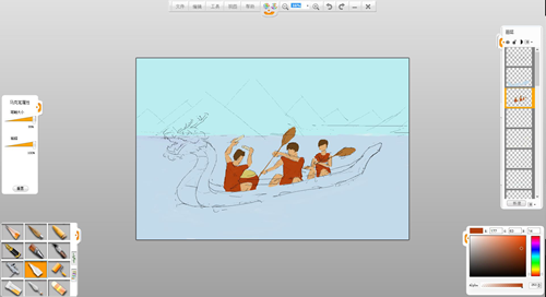 7.用馬克筆筆觸,選擇自己認為適當的顏色,為人物和龍舟涂上顏色。