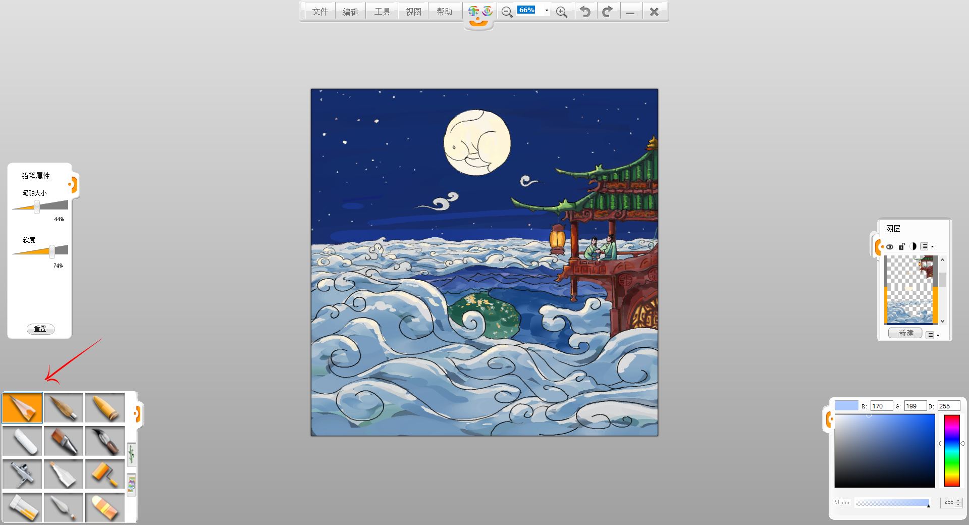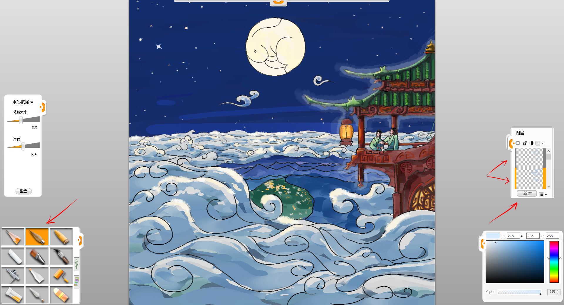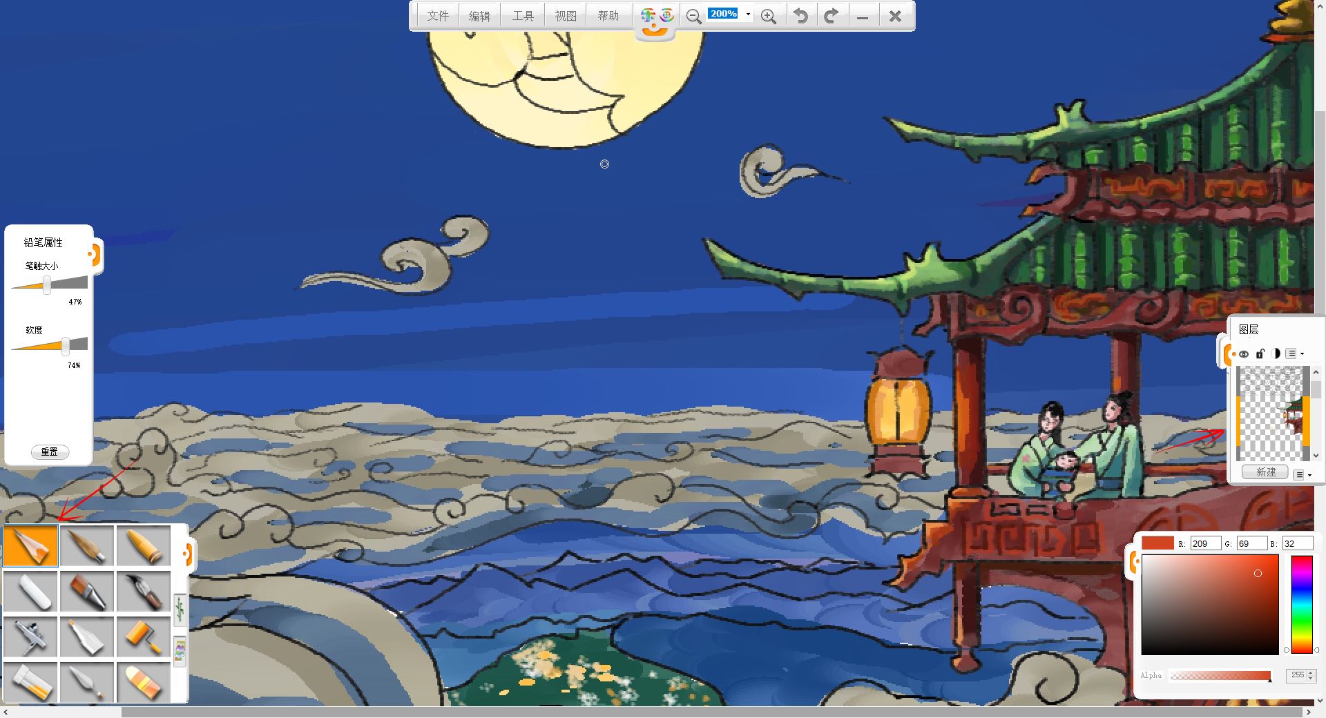 19. 最后潤色調(diào)整些細(xì)節(jié),擦掉一些邊邊角角沒畫好的,這樣一幅中秋瓊宇賞月圖就完成了。