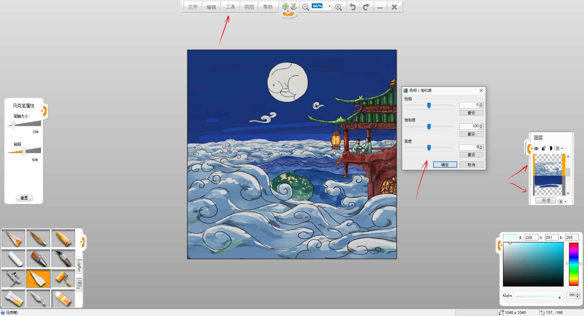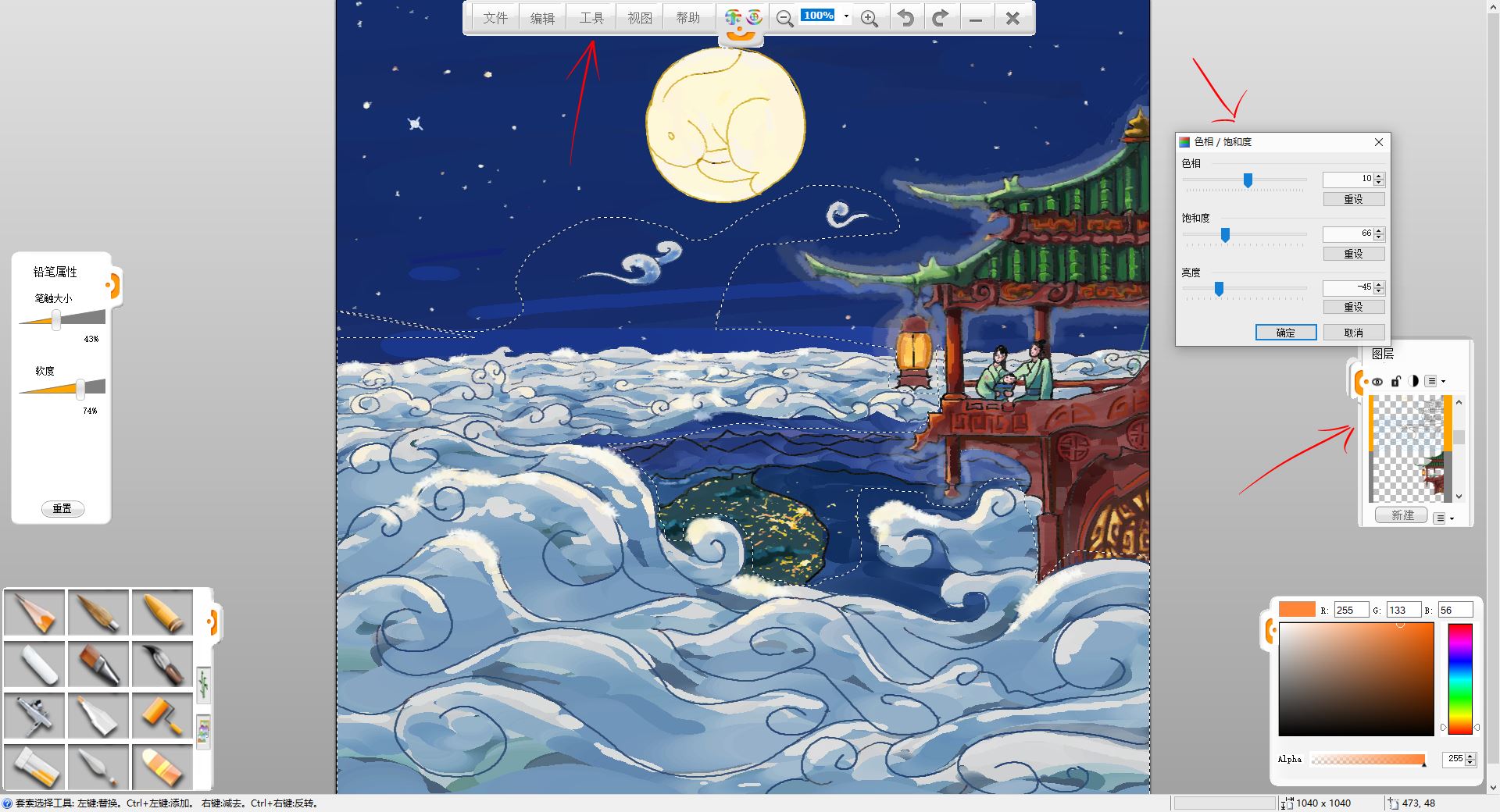 12.用“工具”-“調(diào)整”-“色相/飽和度”調(diào)整工具,調(diào)整云暗面圖層的色相,使其更符合環(huán)境色。然后合并樓宇,人物圖層,使用鉛筆工具,刻畫建筑圖案和陰影等細(xì)節(jié),對著月亮和燈籠的一面偏亮,背著的一面偏暗,線稿也可以稍作調(diào)整。