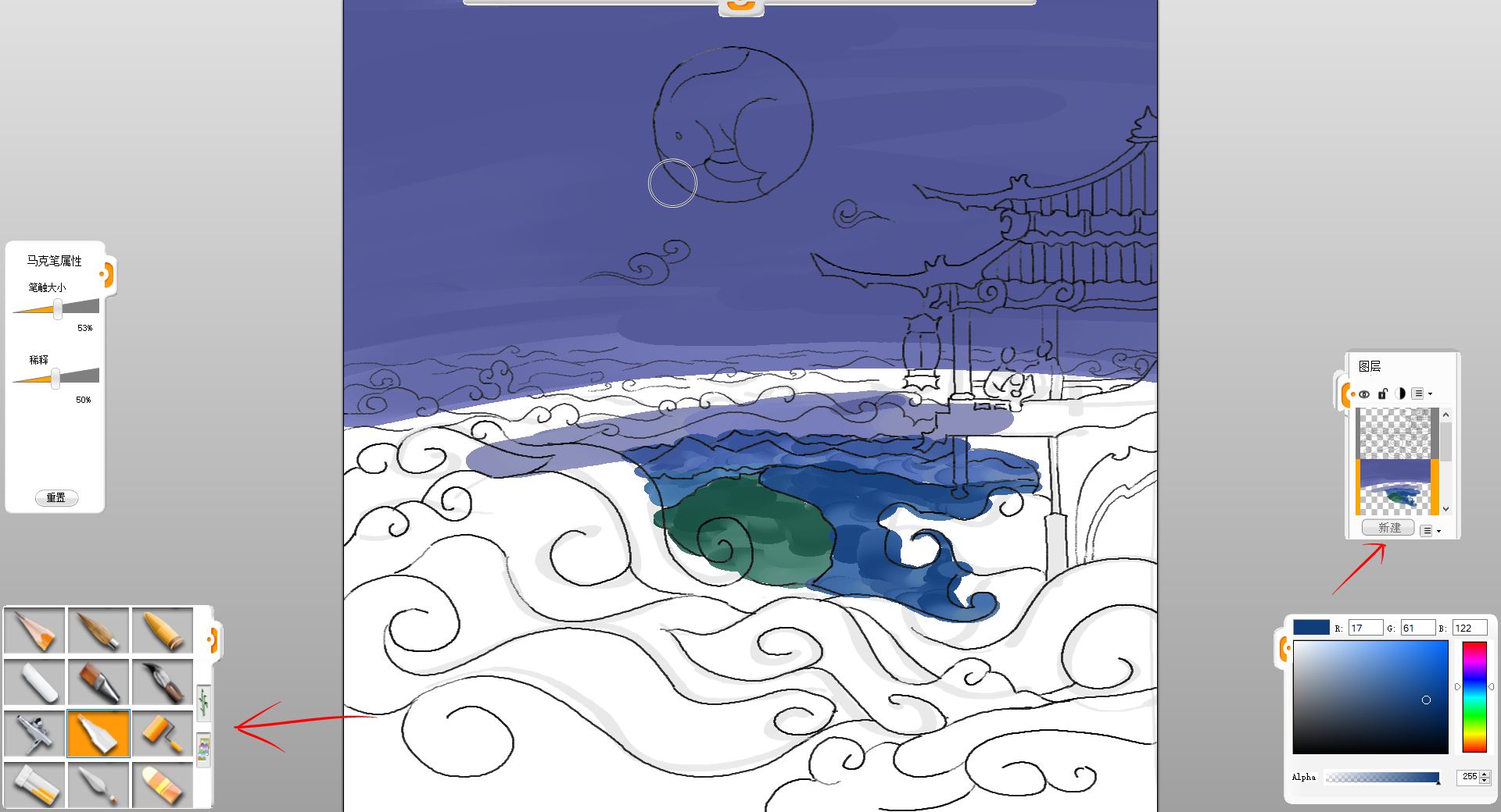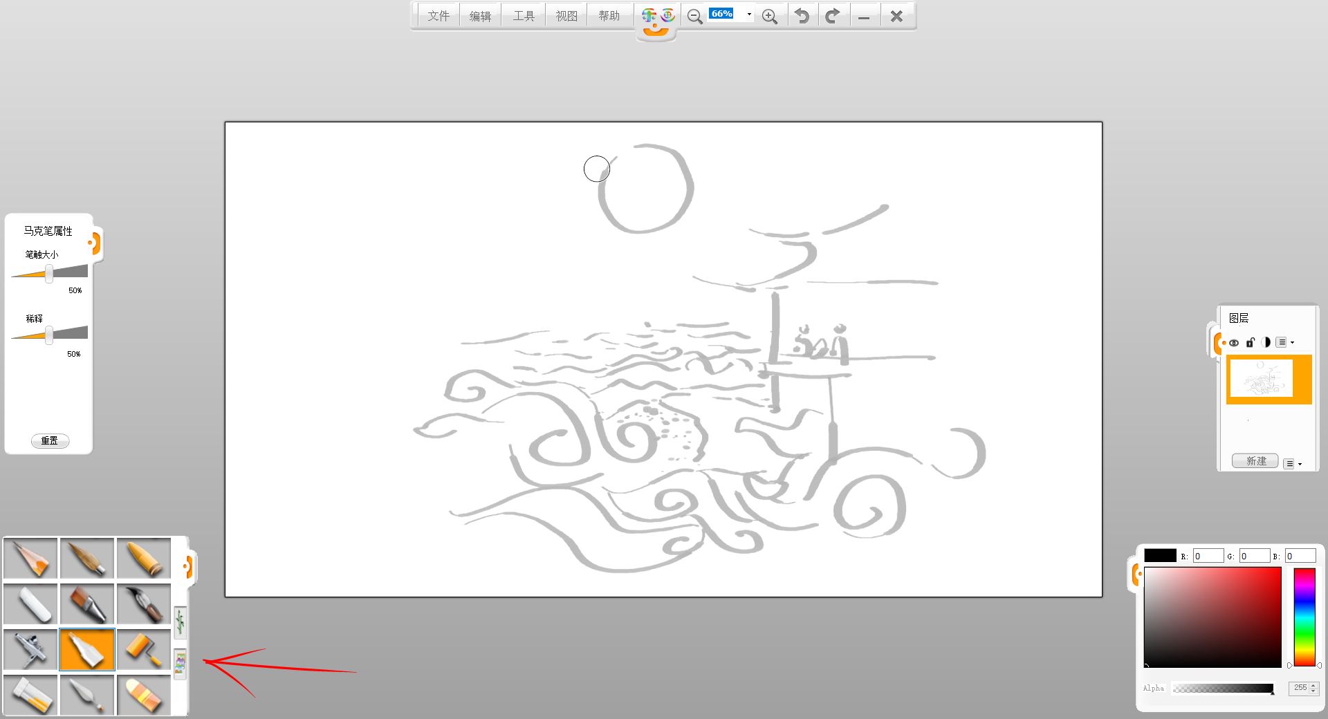 3.使用畫筆欄的馬克筆筆觸,把心中的畫面用單一顏色概略的畫出,確定大概構(gòu)圖,這一步驟畫的草圖最后不顯示,所以不用很精致。