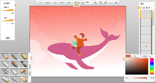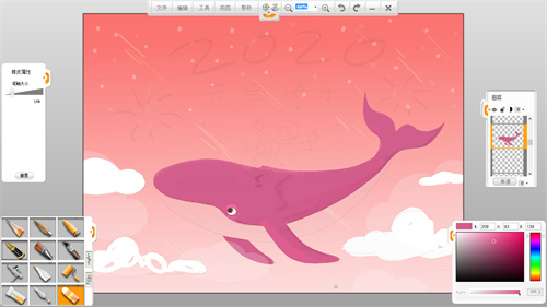 第五步:整體上色。新建圖層,確定整幅畫面的色調,這一步可以暫時忽略細節,把注意力放在確定大的色塊上,考慮主體色調和整體的顏色效果。背景使用樂畫軟件主菜單欄的工具中的“漸變工具”進行填色,云彩用“橢圓工具”選中區域后用“油漆桶工具”填色并調節所在圖層的透明度,鯨魚用蠟筆筆觸填色,邊緣適當使用“橡皮擦工具”修整。