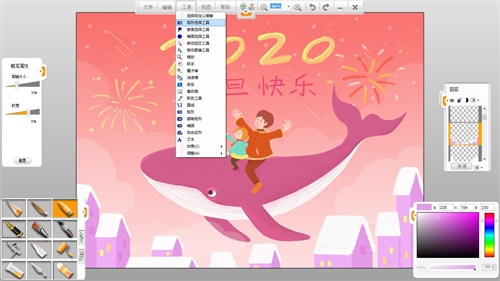 第四步:現在就開始在新建的透明圖層上繪制草圖。用左下角畫筆面板中的“鉛筆”工具,在筆觸上方畫筆屬性面板調節好筆刷的大小和軟硬度,開始繪制草圖。注意構圖,圖像的疏密關系以及圖文的組合。大大的“2020”可以使用蠟筆筆觸重點突出啦。