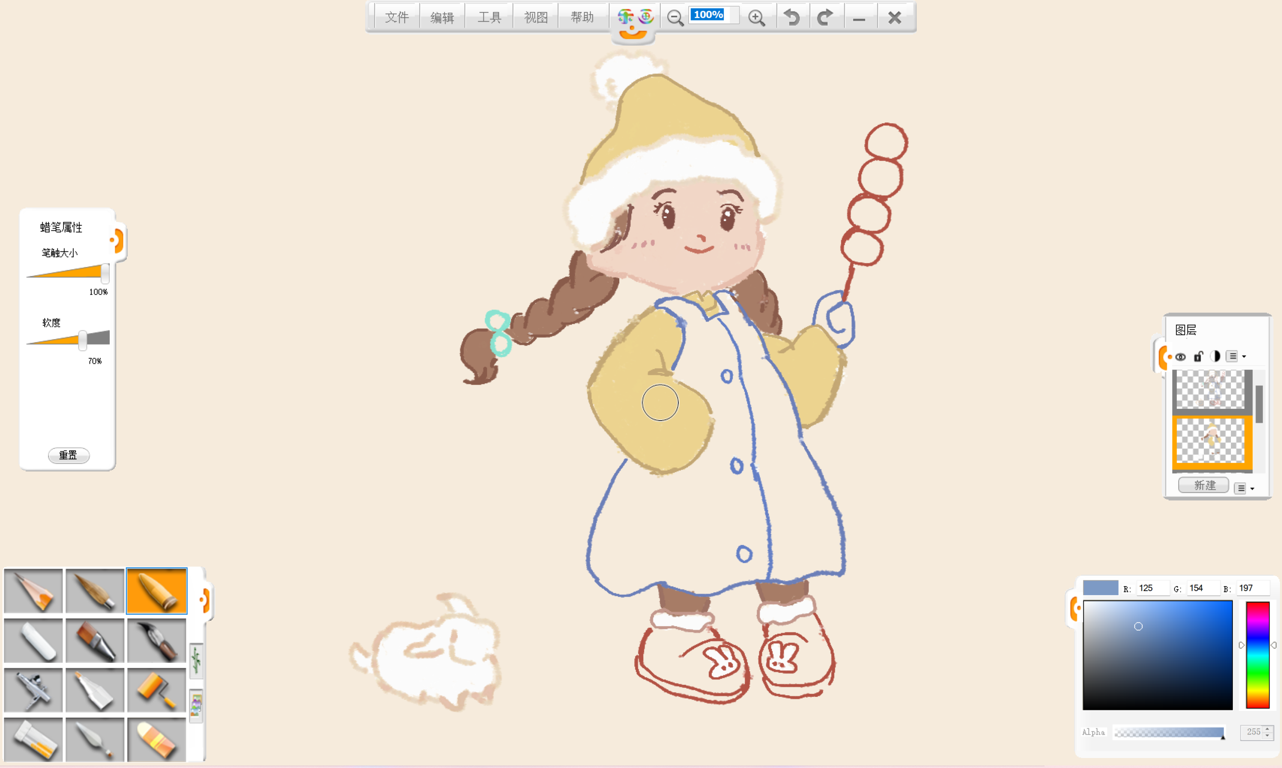 8. 新建圖層,位于勾線(xiàn)圖層下方,用蠟筆工具填充喜歡的顏色。