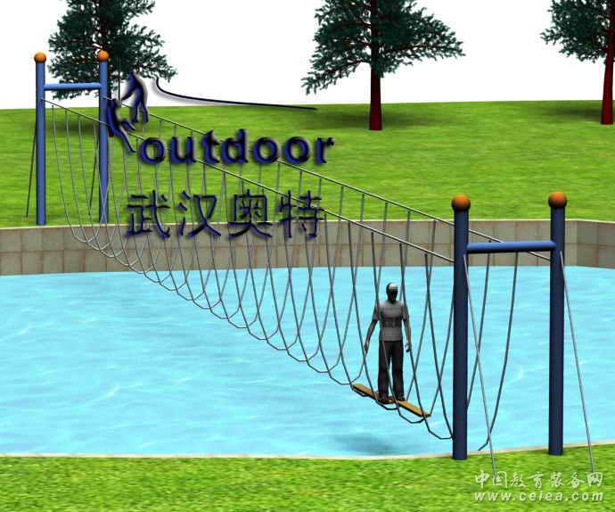 拓展器材產品介紹:參與者需要通過兩塊木板,穿越垂吊鋼纜的趣味橋。