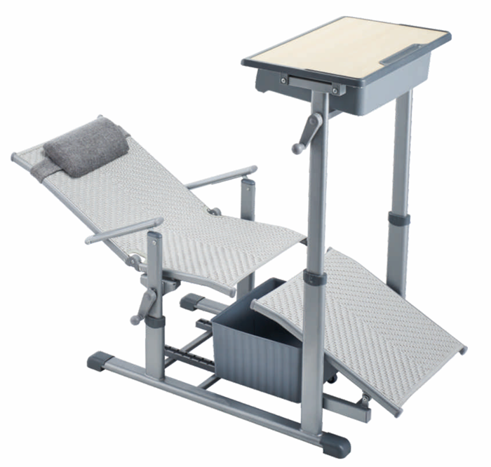 3、課斗規格:350mm*450mm*100mm±3mm,PP塑料一次成型,課斗可水平前后活動80mm,課桌底下前部設置藤質躺板。