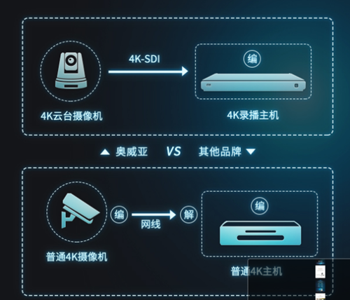 奧威亞作為國內視頻互動與智慧教學方案的主要提供商,2018年,憑借其超強的研發實力和創新能力,研發團隊獨創4K-SDI傳輸技術,4K攝像機無需編碼,即可把4K超高清畫質傳給4K錄播主機,主機收到數據后進行編碼。一次編碼可以避免常規4K方案(網線傳輸)兩次編碼帶來的畫質二次損失,實現近乎無損的效果,奧威亞用4K技術,滿足教學視頻更高畫質的需求。