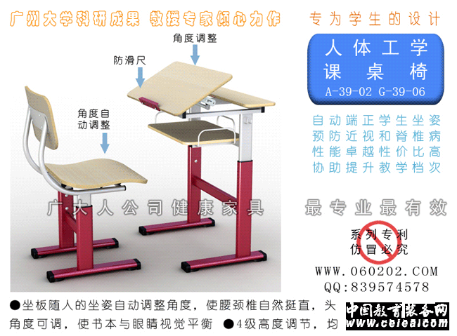 人體工學(xué)課桌椅 預(yù)防近視眼和脊椎病 ·坐板隨人的坐姿自動調(diào)整角度,使腰頸椎自然挺直,頭部自然抬高,眼睛與桌面保持距離。 ·桌板角度可調(diào),使書本與眼睛視覺平行。 ·四級高度調(diào)節(jié)均采用最新國家標(biāo)準(zhǔn)。 HUMAN ENGINGEERING FITMENT Protect students from myopia and backboneillness effectiveely ·The angle of the desk can be adjust, which make your eyes against book directly. ·Seat angle can be adjust automatically,draw yourself up.