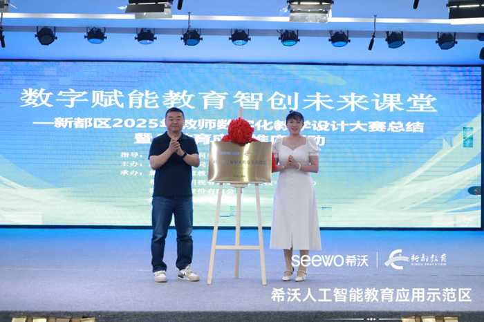 新都區教科院魏院長與希沃成都區域業務負責人高總共同為新都區“希沃人工智能示范區 ”揭牌,標志著區域與企業在深化AI教育應用上達成戰略合作。