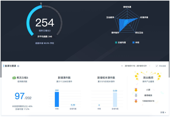 同時,通過智能化分析,將教學過程數據智能轉化為可視化報表,為管理者和老師提供多維度師生數據,并通過報表分析,班級、學校橫向對比等方式,幫助老師和管理者洞察教學過程中出現的問題,支撐有效的教學管理決策,更好地促進教學的提升和老師的專業成長。而這些數據最終都會匯集在基于數據服務的教師發展性評價平臺—“希沃信鴿”上。