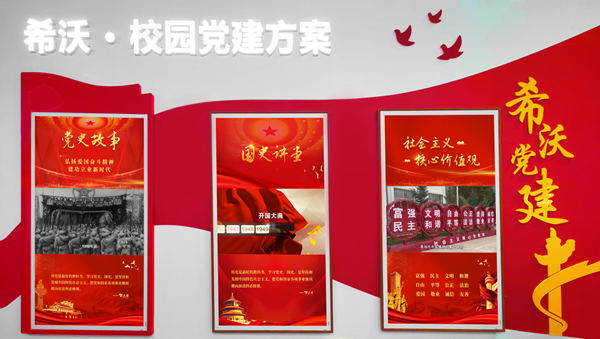 黨建文化墻是基層黨支部,組織生活、支部風采等黨建文化傳播的重要載體。希沃借助自身優勢,將屏顯技術與新時代黨建文化宣傳需求相結合,為黨建文化的推廣傳播提供新的方式。通過其內置海量黨建資源,并通過高清黨建云屏產品以數字化形式呈現《黨史故事》、《國史講堂》、《共筑中國夢》、《黨風廉政》、《社會主義核心價值觀》等黨的鮮明旗幟與思想,最大限度豐富了黨建文化展現形式與內容,提升黨建氛圍。