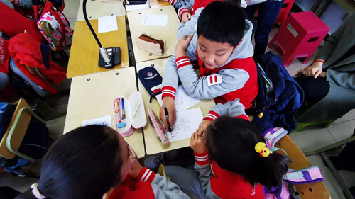 小組之間互相交流討論,每個(gè)小朋友發(fā)揮著各自的想象力。美術(shù)課再也不是傳統(tǒng)的埋頭創(chuàng)作,而是學(xué)生之間創(chuàng)作思路的碰撞、成果的分享。