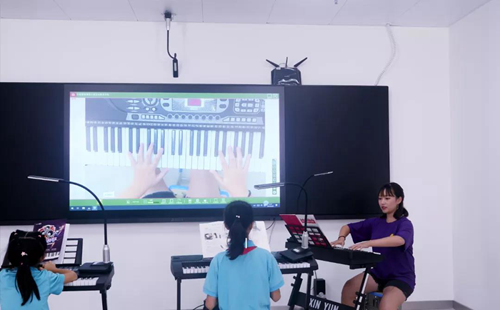 老師通過互動終端,將自己的彈奏示范操作大屏幕展示,每個學生可以即時地看到老師的彈奏過程、手臂動作等細節,直觀地掌握課程要點。