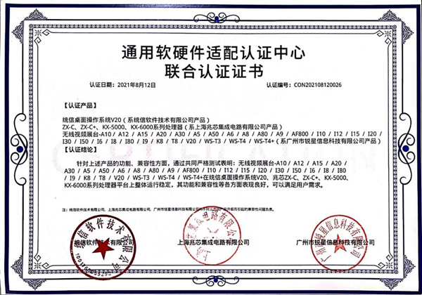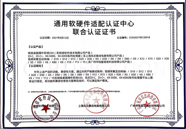兆芯認(rèn)證證書(shū)(無(wú)線視頻展臺(tái)、視頻采集互動(dòng)終端)