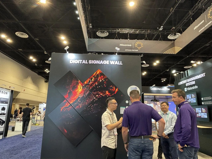 當地時間6月11日至6月13日,全球專業視聽領域盛會InfoComm 2025在美國奧蘭多舉行。海信商用顯示攜場景智慧顯示產品及解決方案亮相,展品涵蓋136英寸COB LED一體機、得來速餐廳場景戶外COB、7*24小時數字標牌DM系列、7*16小時數字標牌DP系列、智慧觸控一體機、商用激光投影及信發集控平臺VisionInfo等,并聯合海信4K三色激光影院產品參展,為零售、教育、辦公、文體娛樂等場景提供數字化轉型新范式。