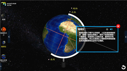 綜合運用3D立體圖、平面圖、語音等多種形式,直觀、詳細描述經度、緯度、地球的自轉公轉、板塊、火山等地理知識,讓學生對全球地理知識有概況把握。
