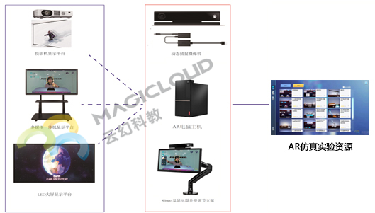 因此,實驗平臺系統的搭建非常便利,需要做的只是選擇一間常規多媒體教室或功能教室(教學場地),現有教學設施(或新建)包括一臺亮度適中的投影機、幕布或電子白板、教師計算機、電子講桌、音響等(多媒體設備),也可以是一臺集成度更好、性價比更高的多媒體教學觸控一體機、推拉組合黑板等,然后增加一臺體感追蹤攝像機、伸縮式支架、AR仿真實驗考試資源及軟件,從而實現多媒體教室的平滑升級。