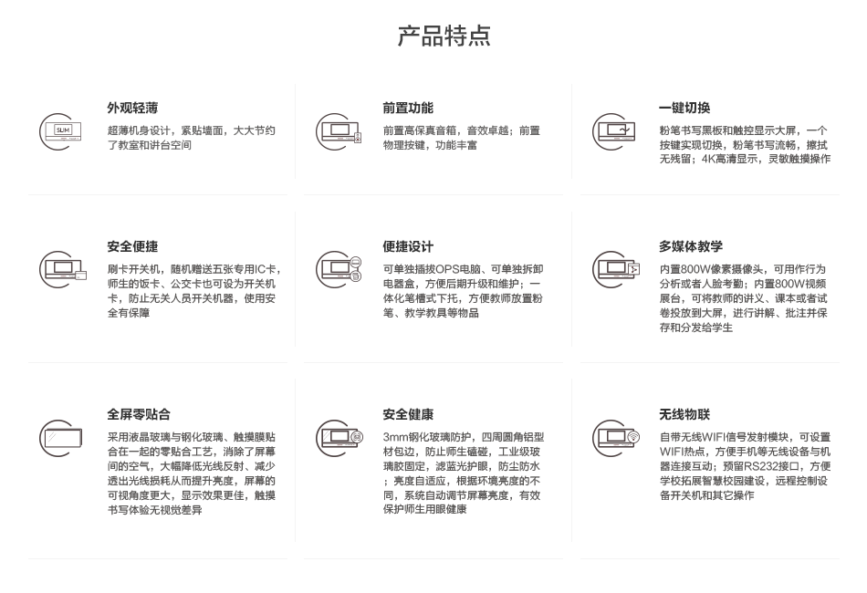 文香超薄智慧黑板在不改變教師使用習慣的基礎上實現了傳統黑板教學與多媒體智慧教學之間的無縫切換。高清顯示,高亮設計,超薄機身,最高支持4K分辨率。超薄智慧黑板采用刷卡開關機,提高了設備使用的安全性;鋼化玻璃采用的是超薄防眩光鋼化玻璃,慮光護眼,健康防塵,安全無銳角;增加了感光模塊,根據使用的環境中的光的亮度自動調節屏幕亮度;插拔式電腦OPS和電器模塊便于安裝和維護。黑板下方一體化筆槽,教師可將粉筆等放置其中。內置視頻展臺(高拍儀)和攝像頭。