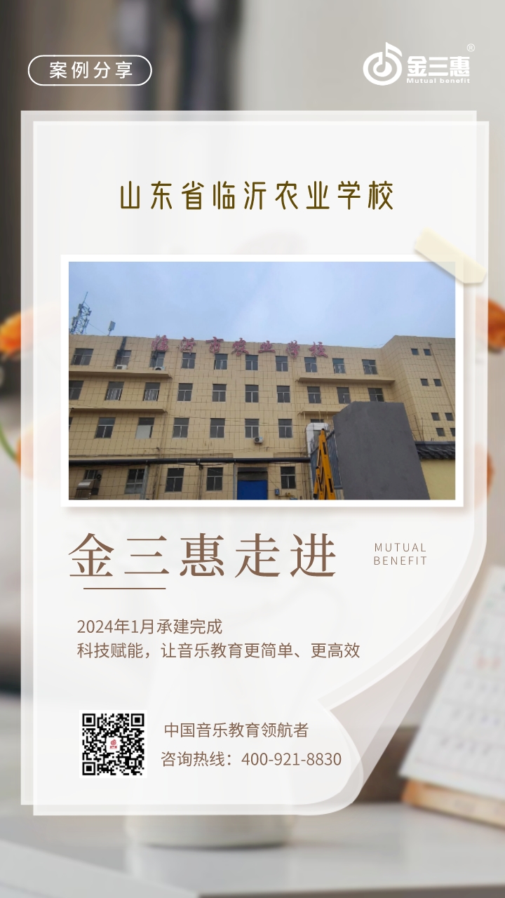 2024年1月,金三惠數字音樂教室走進山東省臨沂農業學校,為學校提供了60+1的電鋼琴教室配備了金三惠電鋼琴教學系統、電鋼琴、數字音樂教學儀等教學教具等。