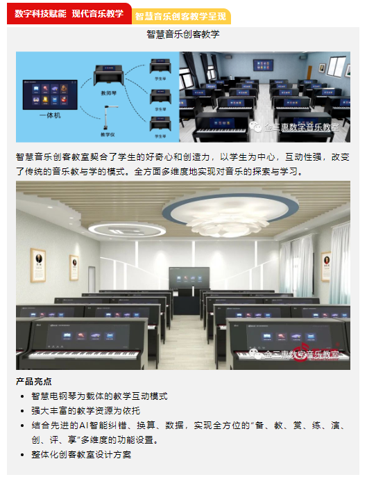 金三惠提供一站式「新常態音樂教室解決方案」「數字音樂教育綜合解決方案」,熱銷產品有:數字音樂教學軟件、美育測評訓練平臺、電鋼琴/電子琴教學管理軟件、電鋼琴教室、智慧音樂素養教室、數字電教板、各大類音樂器材、音樂教學設備等。為區域音樂教育提供管、教、學、評、練綜合平臺,打造智慧平臺+智能硬件+數字資源+智能管控+教學評價為一體的全場景學習生態,實現區域數字化音樂教育轉型。