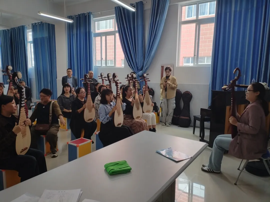教師們沉浸于練習(xí)之中,現(xiàn)場(chǎng)琵琶聲此起彼伏。鄭老師手把手為教師們矯正手勢(shì),調(diào)整力度。