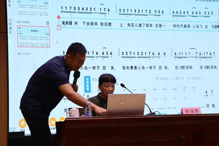 實(shí)操演練環(huán)節(jié),劉浩然老師先是現(xiàn)場(chǎng)邀請(qǐng)了一位教師上臺(tái),對(duì)經(jīng)典歌曲《青春舞曲》進(jìn)行改編,融入泉州地域特色元素。