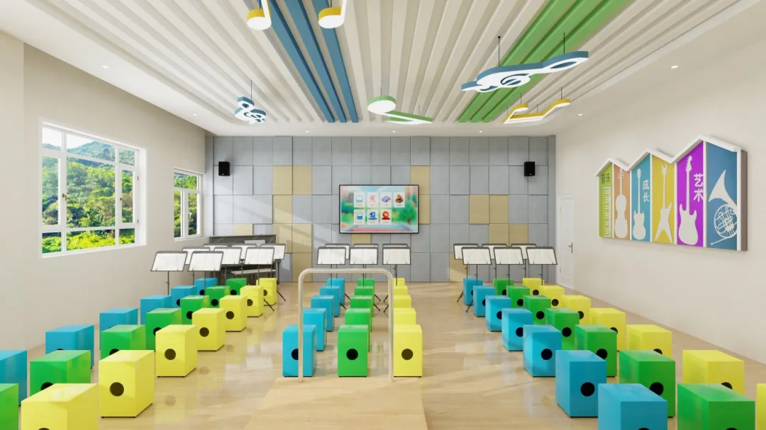 可應用于聲樂教學、樂理教學、樂器教學、音樂興趣小組的開展。也具備了暢游室、合唱室、打擊樂器室、鋼琴房等功能。