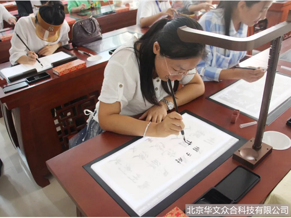 硬件方面,華文眾合歷時四年成功研制出交互式數(shù)字臨摹臺,解決了書法臨摹方面的難題,在臨摹臺上鋪上宣紙就可以用毛筆、墨汁高清臨摹任意字帖和歷代書法家真跡,既降低了書法學習門檻,又可以幫助學生建立書法學習的自信心和自豪感。