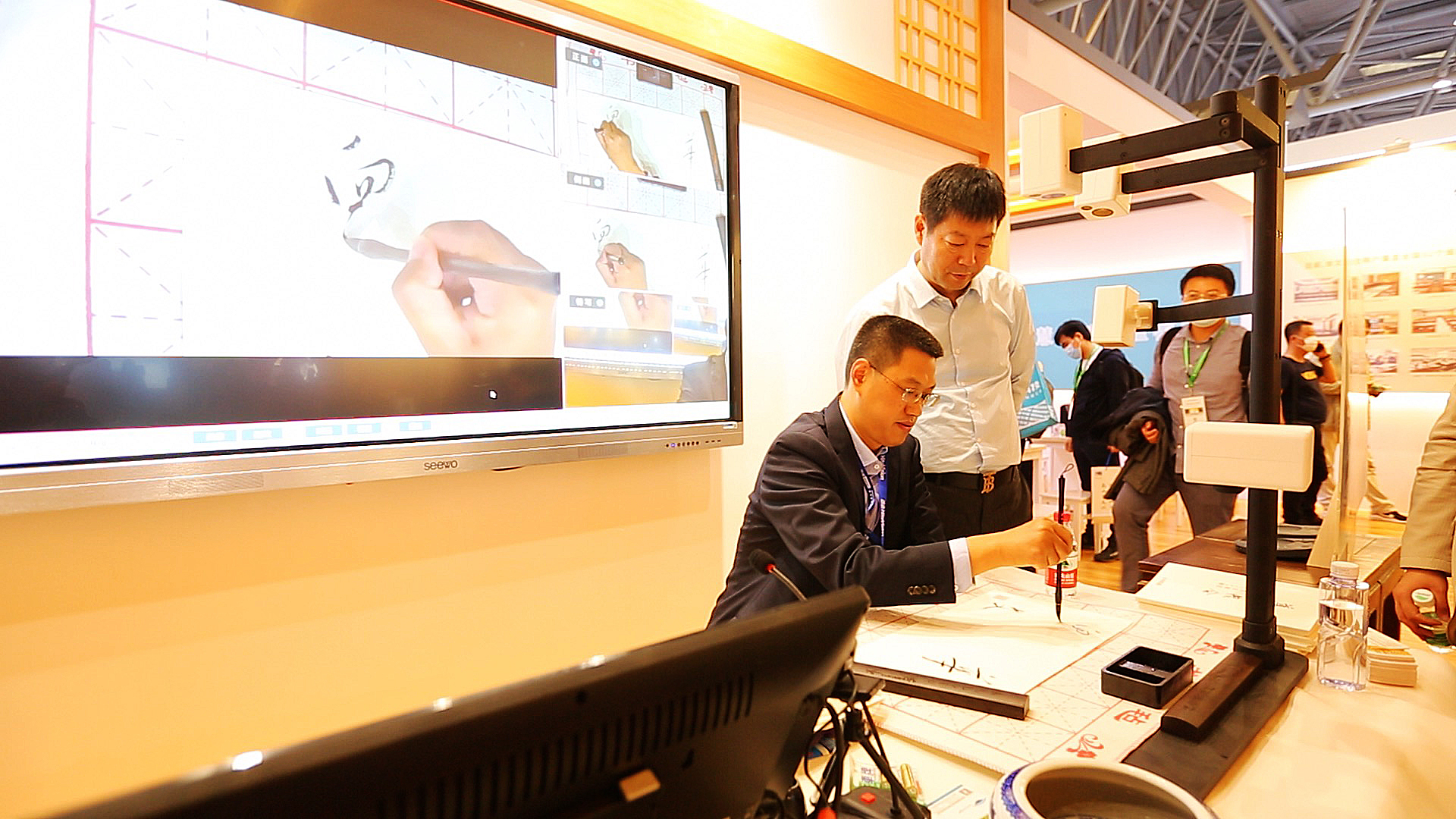 在示范環節中,先進的基于人工智能Ai的筆尖跟蹤技術,為專業書法老師提供良好的示范工具,專業書法老師的書寫過程、運筆細節通過筆尖跟蹤技術可清晰地展現在學生端的交互式數字臨摹臺上,大大提高的示范效率,每一位學生都可以實時觀看。