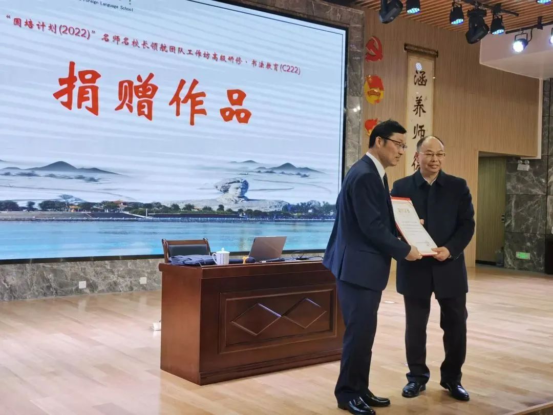 湖南省中小學教師發展中心工會主席、知名書法家李再湘教授向長郡雨外二附小捐贈書法作品