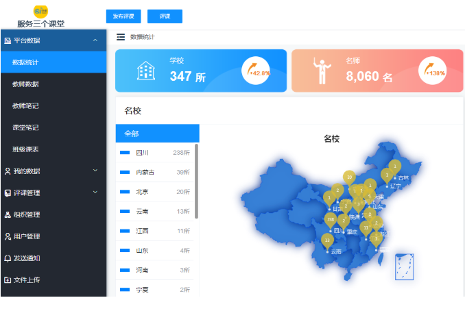 可以實時查看各科教師的課堂實錄、教學模式、S-T行為分析、課堂教學行為、課堂參與度評價等情況; 支持常態(tài)評課 、賽課模式、磨課模式,支持專家線上指導:1)遠程診斷和輔導;2)線上說課活動:說課活動技術保障、策劃組織、展示、評選、專家評價。3)教研工作成果固化和匯編工作;4)線下研修:講師團組織、教育教學管理層、學科骨干老師之間的面對面教學觀摩、座談交流。