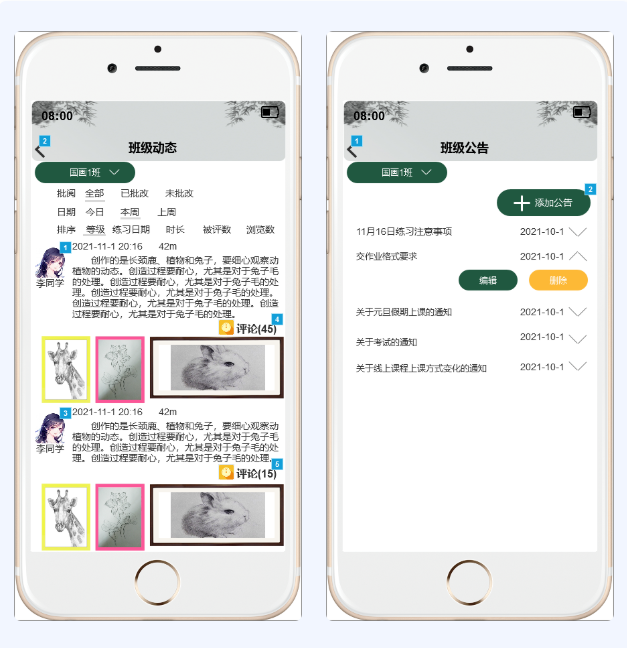直播包括教室端和學生端,通過登錄、幫助、關于常見問題、問題詳情、意見反饋、校園美育、美育詳情、發(fā)布作業(yè)、班級作業(yè)列表、作業(yè)批閱(作業(yè)核查)、每日書畫列表、每日書畫詳情評論等利用直播的方式呈現(xiàn)出來;并方便老師批改作業(yè)而完成老師和學生的互動。