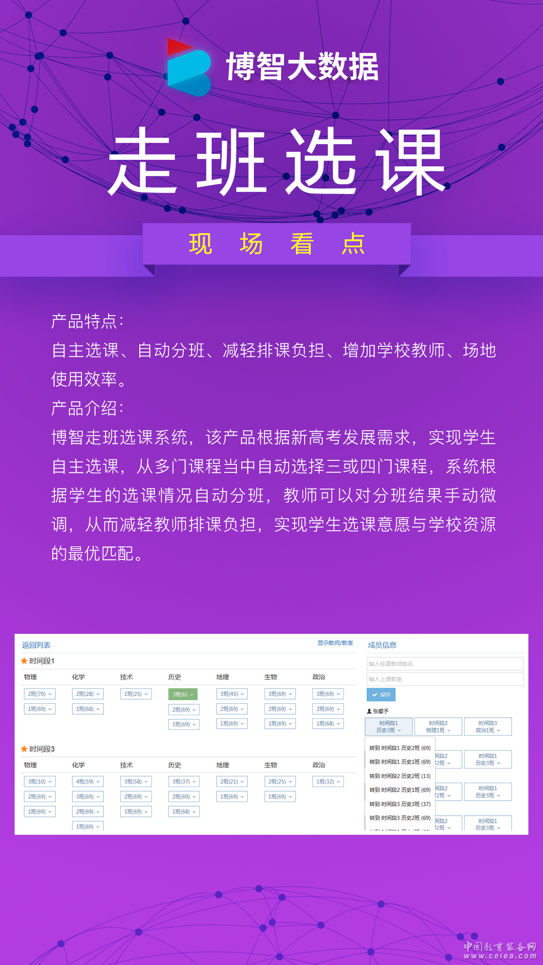 產(chǎn)品詳細(xì)介紹博智走班選課系統(tǒng),該產(chǎn)品根據(jù)新高考發(fā)展需求,實(shí)現(xiàn)學(xué)生自主選課,從多門課程當(dāng)中自動(dòng)選擇三或四門課程,系統(tǒng)根據(jù)學(xué)生的選課情況自動(dòng)分班,教師可以對分班結(jié)果手動(dòng)微調(diào),從而減輕教師排課負(fù)擔(dān),實(shí)現(xiàn)學(xué)生選課意愿與學(xué)校資源的最優(yōu)匹配。 產(chǎn)品特點(diǎn): 自主選課、自動(dòng)分班、減輕排課負(fù)擔(dān)、增加學(xué)校教師、場地使用效率。
