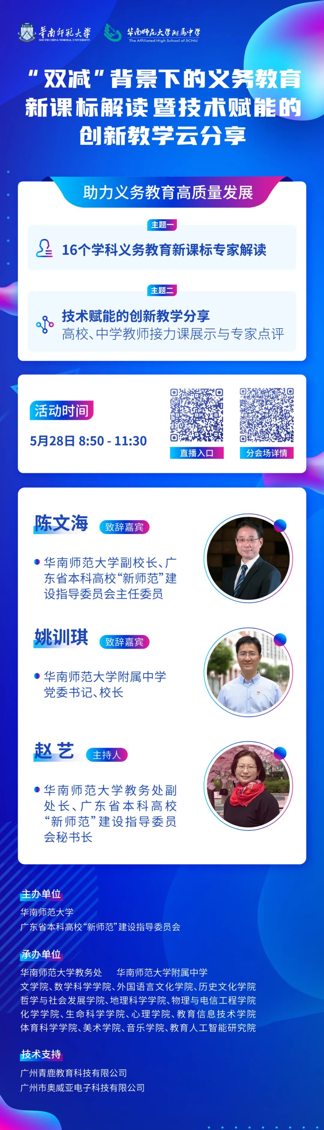 為了更好地助力義務教育高質量發展,廣東省本科高!靶聨煼丁苯ㄔO指導委員會聯合華南師范大學組織主辦“雙減”背景下的義務教育新課標解讀暨技術賦能的創新教學云分享活動,并將于5月28日上午8:50-11:30進行在線直播分享。