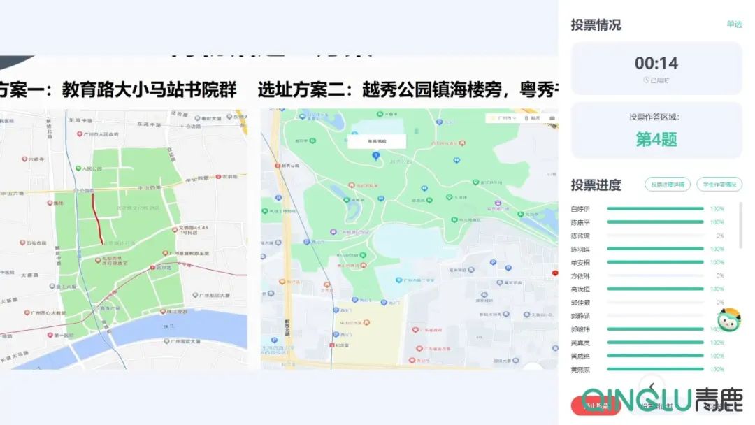 在成果分享與交流的過程中,同學(xué)們還通過青鹿智慧紙筆的投票功能,給各小組提出的展廳設(shè)計方案、博物館選址方案進(jìn)行投票,增強(qiáng)學(xué)生間的互動交流,營造出愉悅輕松的課堂氛圍。