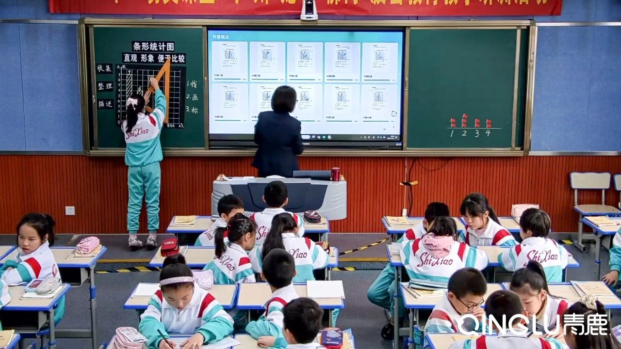 學(xué)生小組通過使用青鹿智能筆書寫探究成果,系統(tǒng)將實(shí)時傳輸書寫內(nèi)容至一體機(jī)大屏;教師可以即時查看學(xué)生完成的情況,并更快速、精準(zhǔn)地對作答情況進(jìn)行講解分析,鞏固學(xué)生對條形統(tǒng)計圖課新學(xué)知識的理解。