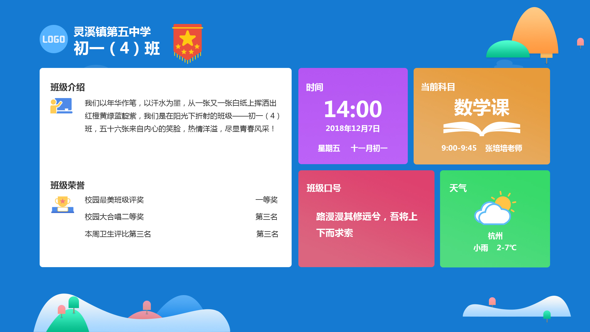 四大模式: 1.精簡模式 當班牌長時間無人點擊時,班牌自動切換成精簡版首頁,展示一些班級介紹、班級榮譽、班級口號、當前科目、時間、天氣等。 2.日常展示 分兩屏展示,可左右滑動,顯示班級信息、班級相冊、天氣信息、通知動態(tài)、當前課程、學生考勤、常規(guī)競賽、留言板等,讓學生一目了然,極大的拓寬了校園信息化的技術環(huán)境。同時使班級、校園文化建設更加生動具體。 3.上課模式 智慧班牌清晰展示當前任課老師以及任課信息,以及學生課堂點名情況。為學校、老師提供便捷的教學管理辦公工具,提升學校的信息化管理水平。 4.考場模式 根據(jù)不同的考試名稱、科目、編號在管理平臺進行編排并同步至智慧班牌,快速有效幫助學生確認考場科目及考試位置等。