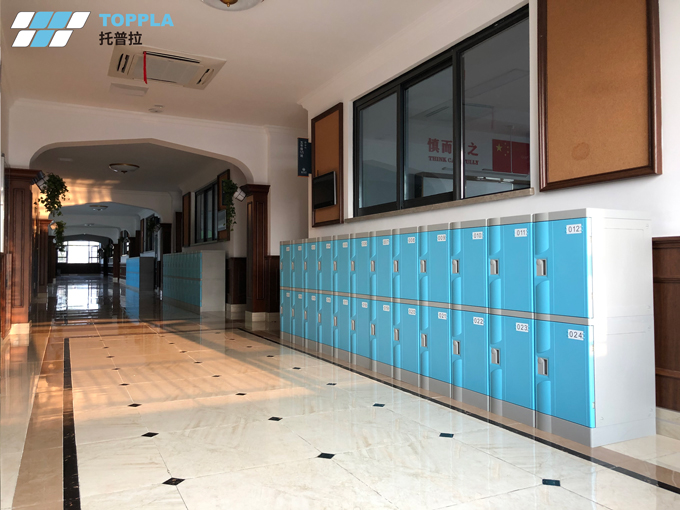 本解決方案使用場景為校園小學部,選取了托普拉第一代全塑儲物柜淺藍色T-320S作為書包柜使用。考慮到孩子身高以及教室窗戶等因素,以2門一列、多列組合使用,置于教室外側走廊,便于小學生存儲物品。