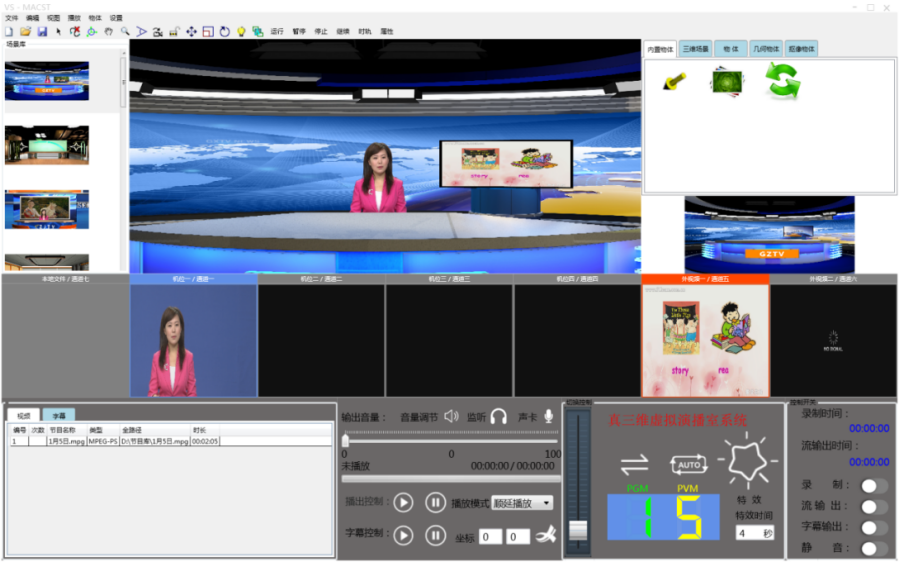 5)導(dǎo)播 導(dǎo)播模式:手動/半自動/自動模式。 支持多種自定義特效。 支持任意虛擬機(jī)位之間的特效切換功能。 支持虛擬機(jī)位和外視頻、本地媒體播放之間的特效切換功能; 外視頻及本地媒體播放,即支持任意多路虛擬大屏幕,同時也支持通道之間特效切換。 支持JPG、PNG格式臺標(biāo)。 支持圖片字幕和文本字幕疊加。 支持外接專用虛擬搖臂導(dǎo)播鍵盤。