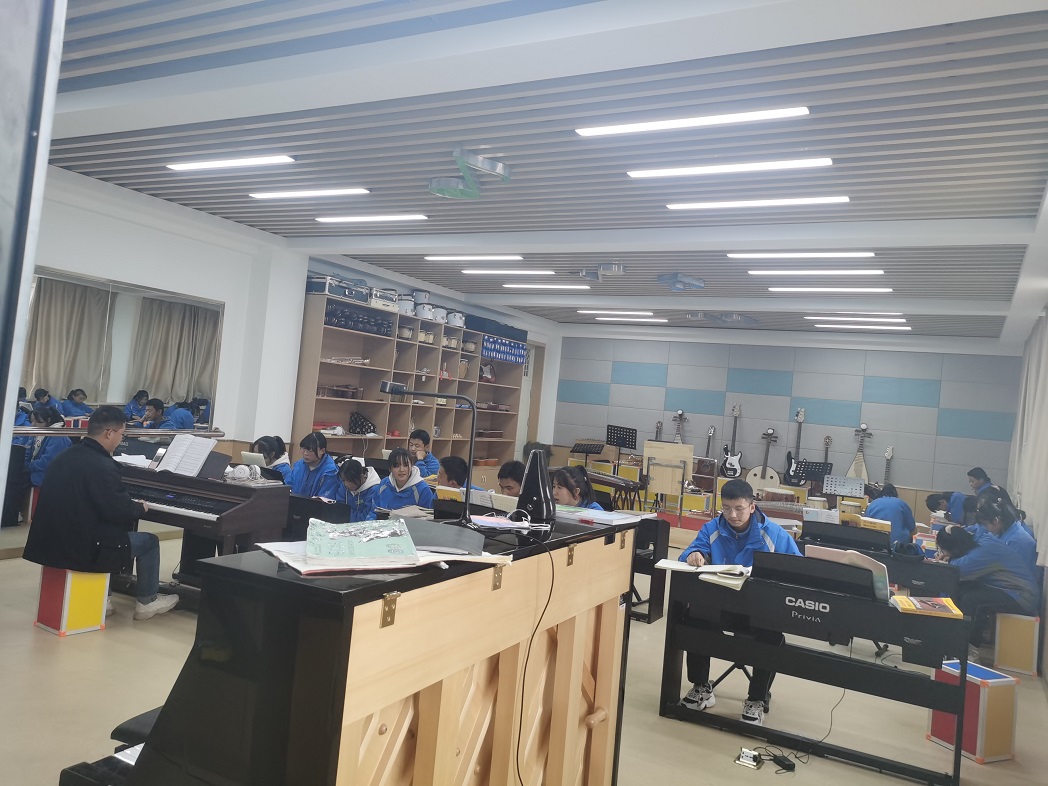 教室使用和慶音樂配備的云音樂教室教學系統軟件、小軍鼓、葫蘆絲、吉它、貝斯、琵琶、古箏、中阮、數碼鋼琴、指揮臺、譜架、音樂凳等常用音樂器材。