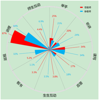 系統(tǒng)通過對校內(nèi)日常教學課程的智能分析,自動建立校內(nèi)所有教師的課堂教學行為的數(shù)據(jù)中心,為校內(nèi)教師的建立可視化的成長曲線;支持不同教師的課堂教學行為數(shù)據(jù)的橫向和縱向?qū)Ρ龋瑸榻處焸體的教學反思和教學方法改進提供輔助的數(shù)據(jù)參考