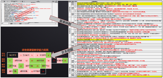 1)教研員基于預置的課堂評價量表進行經(jīng)驗初評,系統(tǒng)將課堂教情數(shù)據(jù)和教研員經(jīng)驗評課的內(nèi)容映射到統(tǒng)一的教學評價量表中,可以自動生成教師教學的能力矩陣,直觀顯示教師突出方面和待改方面。