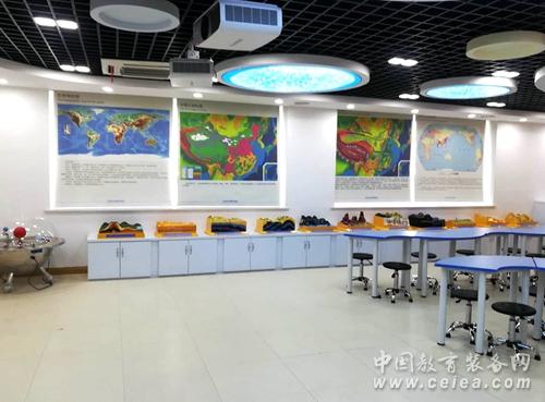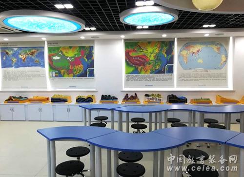 復興中學數字化地理專用教室占地140平方米,教室里配備了數字立體地形、環幕示教系統、地理實驗套裝、地形地貌模型等。在設計上豪華明朗又充滿科技感,與以往專用地理教室相比,教室吊頂層不僅有宇宙星空演示用的天文穹頂,還增加了懸掛式立體太陽系星球,在燈光的襯托下仿佛置身于其中,宇宙的無窮奧秘等著你去探索,這種情境式的教學環境能使學生快速進入學習地理的狀態,提高課堂效率。