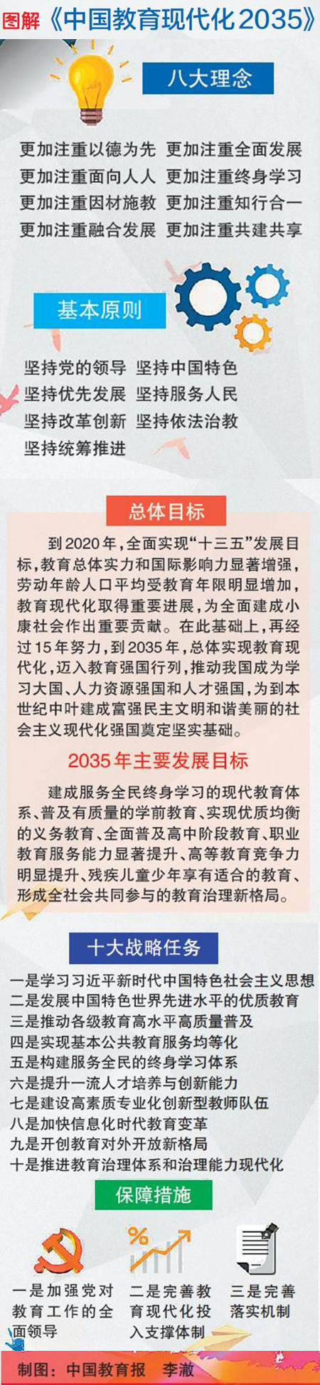 《中國教育現代化2035》分為五個部分:一、戰略背景;二、總體思路;三、戰略任務;四、實施路徑;五、保障措施。