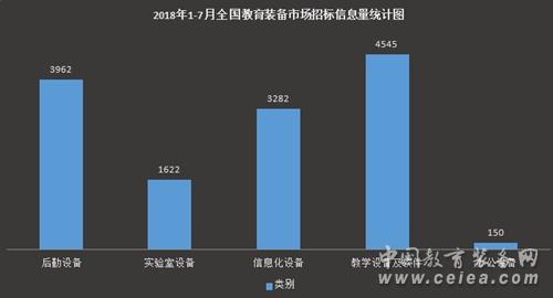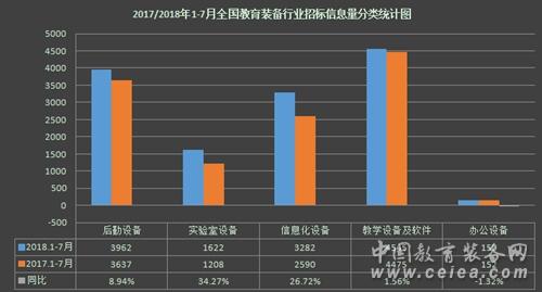 據中國教育裝備網2017、2018年度統計數據,本文將對2018年度全國教育裝備行業招標采購信息進行系統地匯總、整理和分析,同時對比分析2017年1~7月統計數據(因教育裝備領域涵蓋范圍廣泛,為進一步做好相應的數據分析,中國教育裝備網從2018年8月起對全國教育裝備行業招標信息分類進行了調整,由原先的五大類調整為七大類,分別為:信息化設備(含智能平板、錄播系統、智慧黑板等)、后勤設備(含校園基建、安防設備、食堂設備、課桌椅等)、實驗儀器設備(含儀器儀表、實驗室平臺等)、實訓設備(含實訓系統、實訓設施等)、圖書館設備(含借還系統、微型圖書館等)、音體美設備(含樂器、體育設施、美術用品等)、其他專用設備(含心理健康、特教設備等)),揭示出我國教育裝備行業招標采購的現狀及一般規律,助力教育裝備市場快速健康發展。