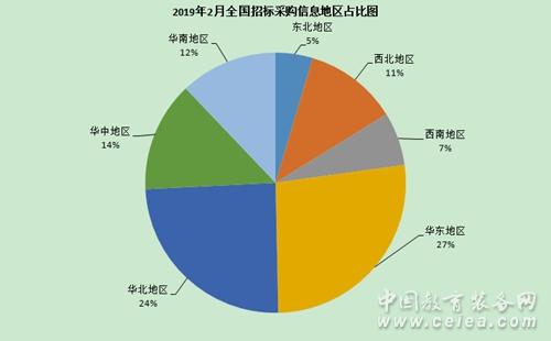 從2月招標采購信息地區統計圖(如圖3所示)和全國招標采購信息量地區占比圖(如圖4所示)來看:華東地區招標采購信息量為502條,占比27%;華北地區招標采購信息量為458條,占比24%;華中地區招標采購信息量為256條,占比14%;華南地區招標信息采購量為226條,占比12%;西北地區招標采購信息量為216條,占比11%;西南地區招標采購信息量為124條,占比7%;東北地區招標采購信息量為86條,占比5%。