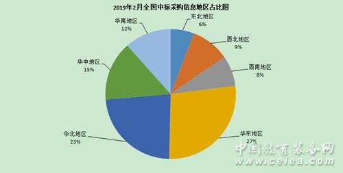 從2月中標信息地區統計圖(如圖8所示)和全國中標信息地區占比圖(如圖9所示)來看:華東地區中標信息量為430條,占比27%;華北地區中標信息量為366條,占比23%;華中地區中標信息量為232條,占比15%;華南地區中標信息量為182條,占比12%;西北地區中標信息量為150條,占比9%;西南地區招中標信息量為120條,占比8%;東北地區中標信息量為92條,占比6%。