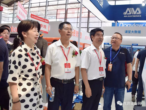 ▲中國(guó)教育裝備行業(yè)協(xié)會(huì)會(huì)長(zhǎng)王富、陜西省教育廳、陜西省教育廳教育技術(shù)裝備管理中心領(lǐng)導(dǎo)巡展現(xiàn)場(chǎng)