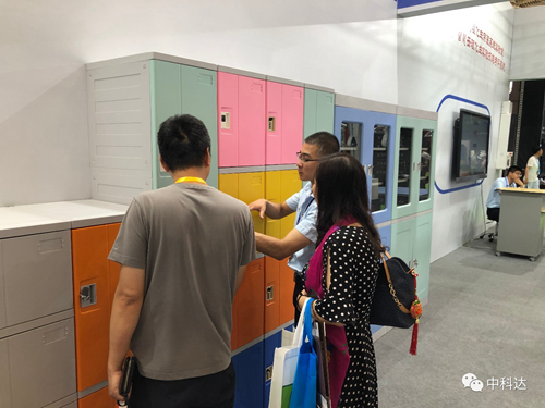 ▲工作人員向觀眾介紹ABS書包柜